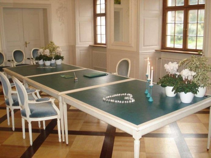 Der Trausaal der Stadt Wehr befindet sich im Neuen Schloss. Dieses wurde 1748von den Freiherren von Schönau als Herrensitz erbaut. Es wurde 1825 aufgestockt und ist seit 100 Jahren das Rathaus der Stadt Wehr. Durch seinen barocken Stil bietet der Trausaal den festlichen Rahmen für Ihre Trauung. Sitzplätze: 25