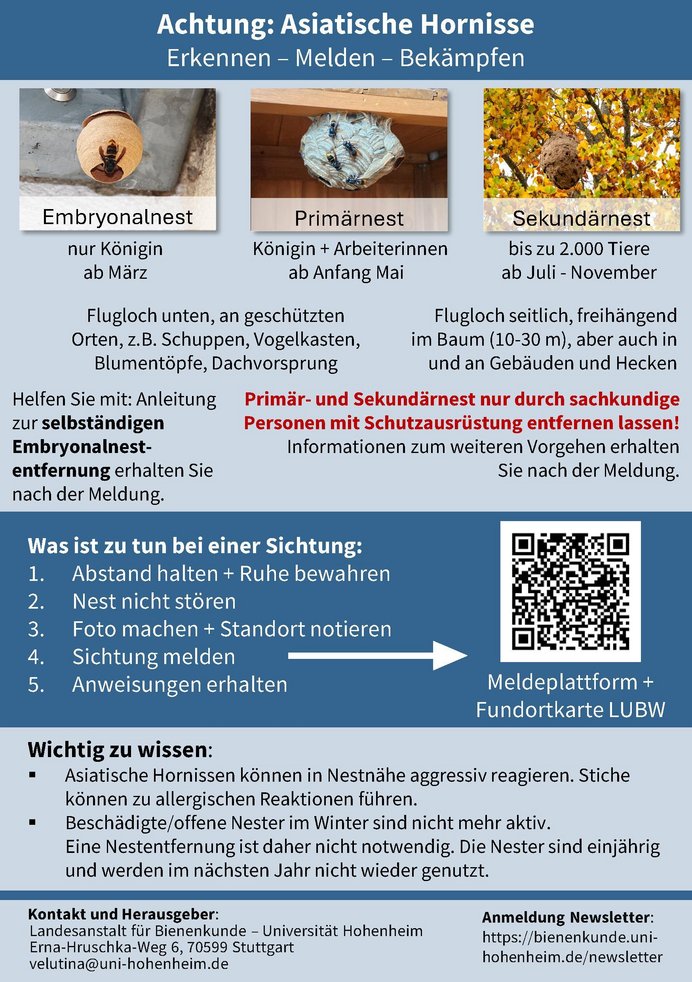 Alle relevanten Informationen zur Asiatischen Hornisse finden Sie auch auf einem kompakten Informationsblatt der Landesanstalt für Bienenkunde unter https://bienenkunde.uni-hohenheim.de/fileadmin/einrichtungen/bienenkunde/PDF/Vespa_Velutina/Flyer_DinA5-Velutina_LAB_final.pdf